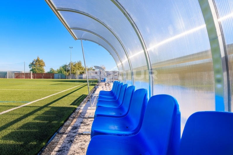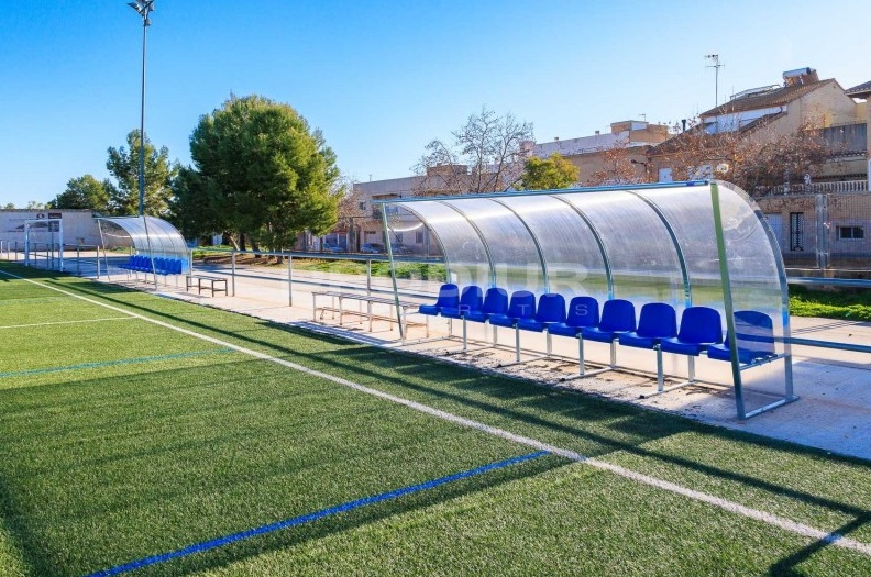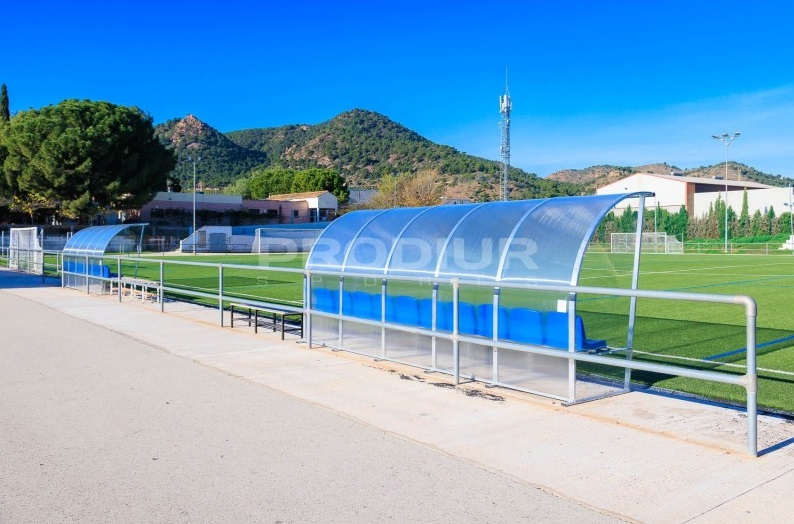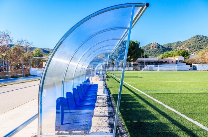 Nuevos Banquillos Suplentes Futbol instalados en el campo de futbol municipal de una población de la provincia de Valencia. Hemos suministrado dos unidades de banquillos de 10 plazas de aforo cada uno (disponibles en otras medidas).