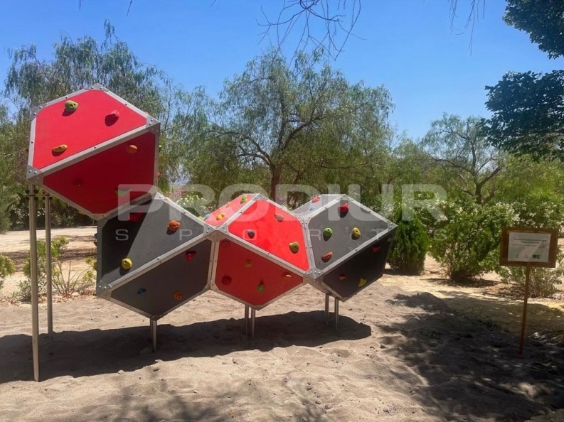 El modelo de rocódromo ROC6 cuenta con cuatro bloques de escalada unidos, equipados con diferentes presas para poder escalar por todos lados.